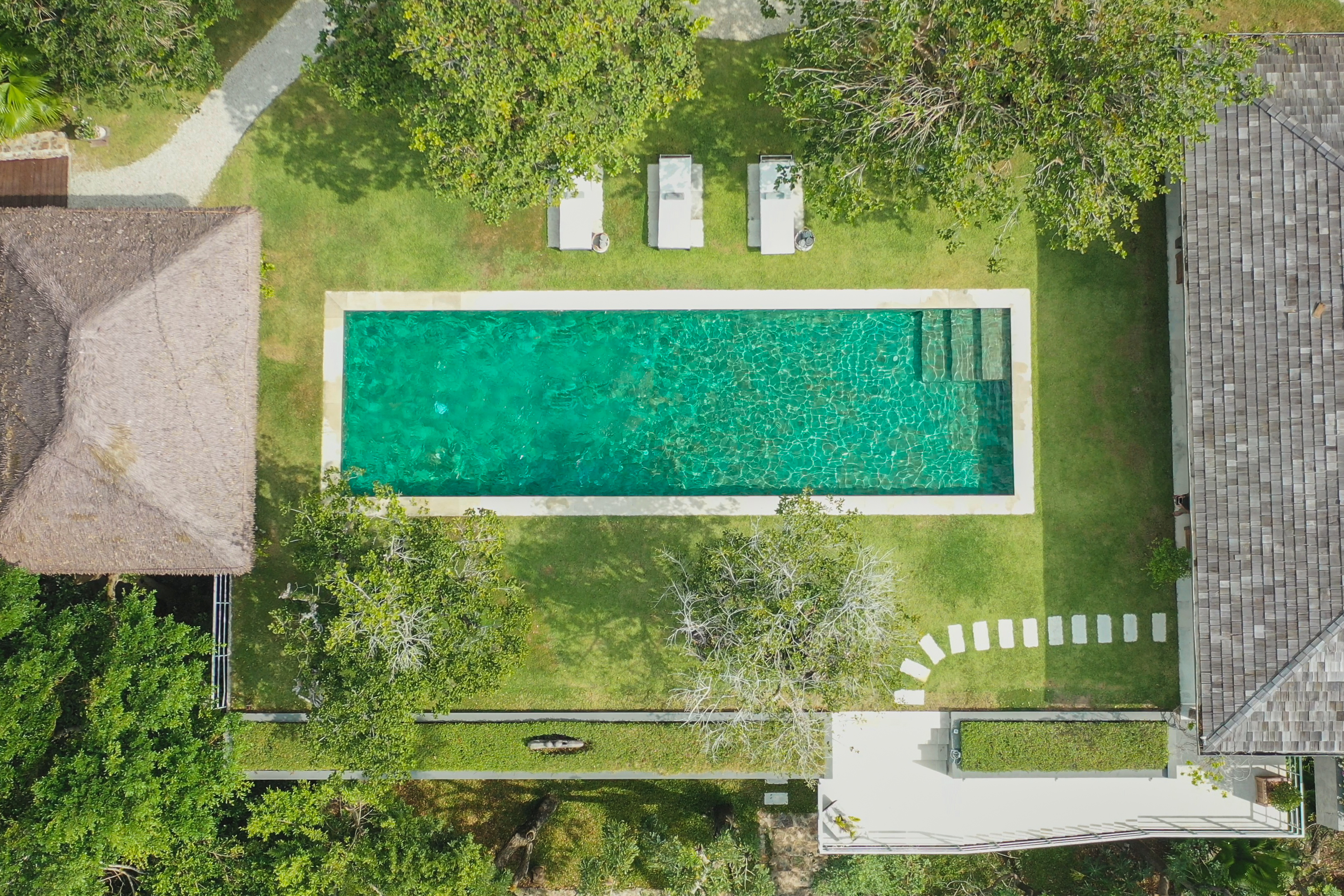 Meanwhile, for sun lovers, a 14-metre lap pool is surrounded by a lawned sun terrace with relaxing sunbeds and umbrellas. A thatched Balinese sala nearby is furnished with large comfortable cushions and a low wooden coffee table, a lovely and shaded spot to enjoy a casual lunch or to relax and recharge with a massage.